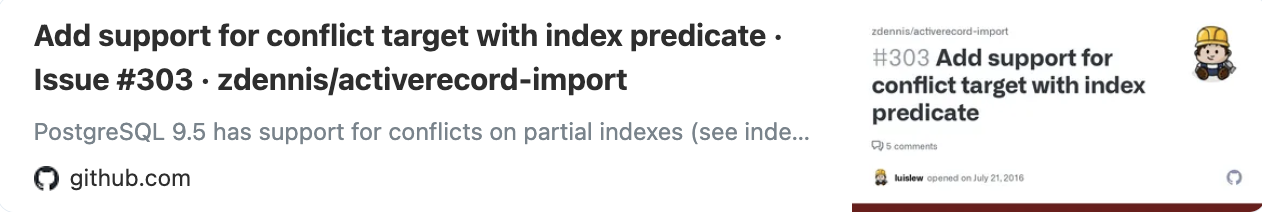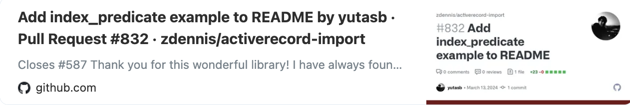 activerecord-importで「index predicate」について検索すると、以下のIssueに紐づくPRで導入されていることがわかりました。